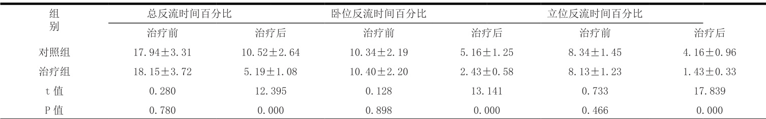 检测食管动力学 , 包括立位反流时间百分比、卧位反流时间百分比、总反流时间百分比。测定时间治疗前、治疗两星期。