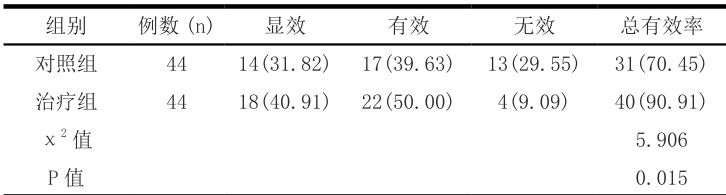 治疗组高于对照组,组间差异比较 P<0.05 。见表 2。表 2 治疗效果 [n(%)]