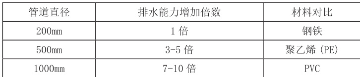 其中,Q 表示排水流量, A 为管道的横截面积,V 为流速。管道直径增大时,管道的横截面积增大,进而提高排水能力。以常规雨水流量计算,直径从 200mm 增至500mm 的管道排水能力可增加3-5 倍。详情如表1 所示。