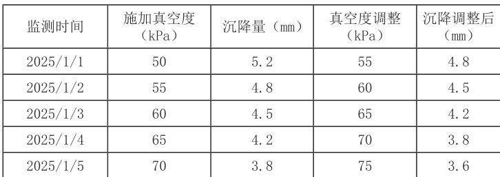处于真空预压施工进行阶段,实时对土体变化展开监测十分关键,采用定期监测的办法,获取土体沉降、真空度等关键指标,可迅速对施工方案进行调整,保障土体在既定的压力范围里压实,利用传感器、沉降仪等设备可实现监测数据的获取,可反映出土体产生的物理变化,还可辅助对施工进程中可能出现的问题加以预测与防范。若监测到沉降速度呈现过快态势时,可恰当时候调整真空压力,以防出现土体过度压缩与不均匀压缩情形,如下表格呈现出某项目施工的时候,真空预压时沉降跟真空度的变动情形,在开展真空度施加的进程里,沉降量不断下降,说明土体正逐步实现预期的压实成效,对施压过程开展实时监测与调整,实现了施工质量稳定性的保障。详情见表1。