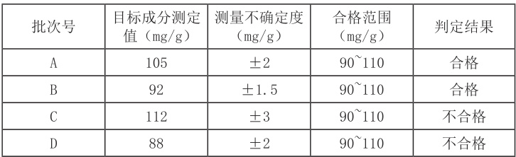 (2)将药材中目标成分的测定值与合格范围进行比较。如果测定值在合格范围内,且测量不确定度的影响在可接受范围内,则判定药材符合规定。