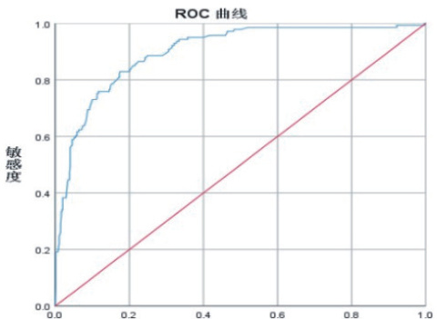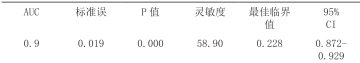 白城市农村居民的发病危险因素包括年龄、初潮年龄、避孕药、乳腺癌家族史、焦虑、乳腺炎病史。模型评价本研究模型ROC 曲线下面积为0.9,最佳临界值为 0.228,灵敏度为 58.9% ,特异度为 95.3% 。本模型预测乳腺癌发病的正确率为 76% ,乳腺癌不发病的正确率为 90% ,全组正确率为87.8%⨀ 。(见图1,表1)。