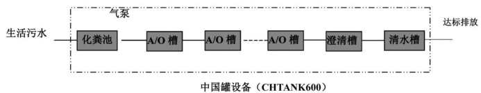 生活污水首先通过自流方式进入化粪槽进行预处理,之后被气提方式引入各同步 A/O 生化处理单元,在设备中逐级经过各同步厌氧- 好氧反应槽,经过微生物的充分降解,混合液流入经澄清槽进行固液分离流入清水槽,然后达标排放。