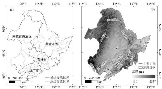 东 北 地 区 位 于 中 国 大 陆 东 北 部, 地 理 位 置 在115° 05’E-135° 02’E, 38∘ 40’ N-53∘ 34’N 之间,土地总面积约124 万平方千米。东北地区东、北、西三面为山脉所环绕,中部是一片广阔的大平原。东是长白山脉,西有大兴安岭和辽西山地,北为小兴安岭(图 1a)。研究区分为 7 个地理区域,如图 1(b) 所示。从东到西依次又划分为东部山地(X1)与三江平原湿润气候区(X5)、小兴安岭湿润气候区(X4)、大兴安岭半湿润气候区(X2)、松辽平原半湿润气候区(X6);西辽河平原(X7)与蒙东半干旱气候区(X3)[9]。