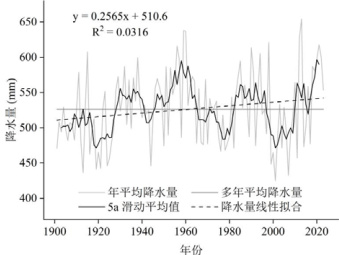以年为单位,计算得到研究区范围内 1901-2023 年平均降水量变化及Mann- Kendall 突变检验折线图,结果如图 2 所示。在图中可以看出,研究区年平均降水量在 425.11-654.27 mm 之间,且分别在 2001 年和 2013年达到了最小值和最大值。多年平均降水量为 526.50mm ,而历年的降水量都在这一平均值的上下波动。年平均降水量呈缓慢增长状态,倾向率为2.565 mm/10a ,即降水量平均每 10 年会上升 2.565mm 。