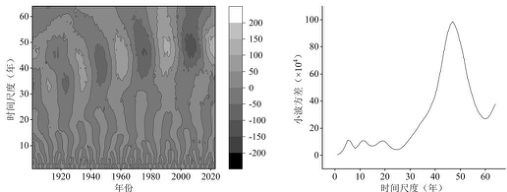 基于 CMOR 小波函数对研究区年降水序列做连续小波变换,分析结果如图 4 所示。年降水量存在多个短震荡周期及 40-50a 的长震荡周期。其中长震荡周期信号在整个分析时段表现比较稳定,具有全域性,且小波方差在47a 周期尺度出现峰值,为年降水量的第一主周期。
