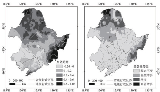 研究区1901-2023 年降水量变化趋势及其显著性空间分布如图6 所示,年降水量 Sen's slope 计算结果介于 -0.24 — 1.05 之间。空间变化趋势方面,研究区东部、北部及东南部分区域降水量呈现出上升趋势,中南部则主要呈现出下降趋势。显著性方面,研究区绝大部分区域的变化趋势均不显著,仅东部及西北部的部分区域存在一定显著性,其中大兴安岭北部的部分区域存在强显著状态。