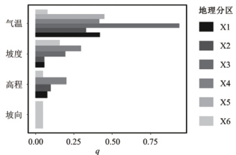 对所有地理分区分别进行因子探测后,通过 0.05 显著性检验的地理因子如图7 所示。由图可知,在气温、高程、坡度、坡向四个地理因子中,X7 地区没有任何因子通过显著性检验;仅X6 地区的坡向因子通过了显著性检验,但该地区各因子对降水量的解释力均低于其他地区对应因子的解释力;另外五个地区 各地理因子对降水量的解释力分布相对类似,气温因子的解释力均超过了 25% ,远高于其他因子,是对降水量空间分布格局影响最显著的主导因子,其中尤其以 X3 地区为甚,由于该区域为大兴安岭西部 的呼伦贝尔高原牧区,气候较为干旱,地势平坦,气温与降水间相关性极大,故该区域气温因子对降水量的解释力达到了 93.7% 。此外,在各地理分区中,X4 地区的高程及坡度两个因子对降水量的解释力显著高于其他因子,说明相较于其他区域,小兴安岭山区降水量受高程及坡度影响更加明显。