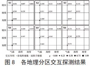 由于 X7 区域没有任何因子通过显著性检验,故仅对其他地理分区进行交互探测分析,其结果如图 8 所示。所有地区各地理因子的交互作用均为非线性增强或双因子增强,即 q(X1∩X2)>Max(q(X1),q(X2)) ,不同因子在共同作用时对降水量的解释力会出现不同程度的增加。与全区域地理探测器结果类似,各主导影响因素均为气温与高程,而次要影响因素多为气温与坡度。其中由于 X3 地区降水量受气温影响极其强烈,故在交互作用下其他因子的作用较小;X3 以外的各地区中,X1 地区的主导交互影响因素对降水量的解释力最强,达到了 80% 以上;X6 地区的主导交互影响因素对降水量的解释力最弱,为 35.1%⨀c 。