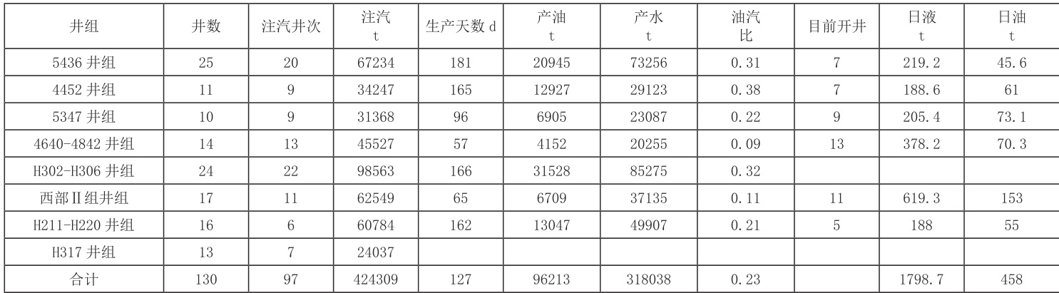 8 个井组共有 130 口井,注汽井共 97 口,共累注 42.4×104t,累油 9.6×104t ,油汽比 0.23,目前井组共日产液 1798.7t,日产油 458t。(表 1)