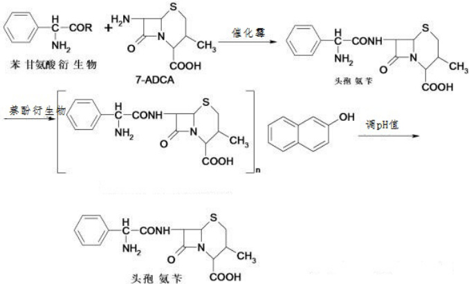该头孢氨苄的制备工艺以水为溶剂 7-ADCA 与苯甘氨酸衍生物在酰化酶的催化下,在常温常压下进行反应,使 7-ADCA 的转化率可以达到99%以上。反应结束后经过简单的后处理,将反应液进行过滤、结晶、离心、干燥得到头孢氨苄。本工艺反应过程不用有机溶剂避免了对环境的污染,母液中残留的产品再通过萃取分离结晶加以回收套用,提高了产品收率,降低了生产成本。