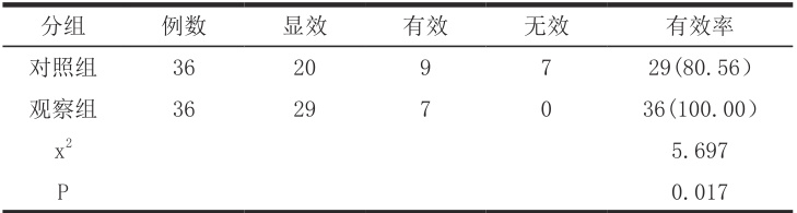 两组治疗效果比较,观察组有效率更高( P<0.05 )。见表1。