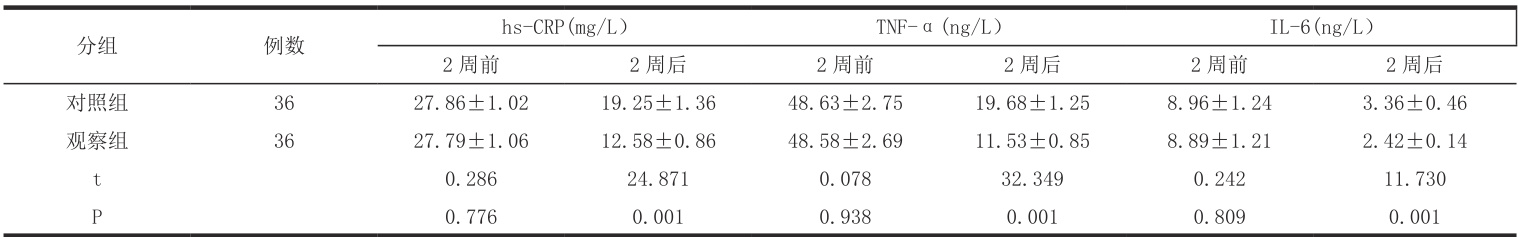 比较两组炎症因子水平,2 周前无差异( P>0.05 );2 周后,观察组hs-CRP、TNF- ∝ 、IL-6 水平更低( P<0.05 )。见表 2
