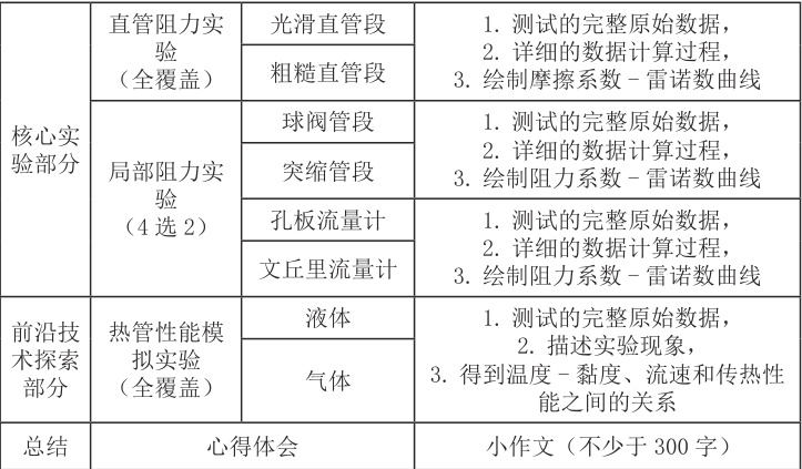实验报告除了囊括本实验中涉及的核心数据处理计算过程及实验曲线的绘制、前沿热管模拟实验的探究,还额外的增加了心得体会(例如后续可以提高或优化点和措施或收获,怎么认识单一变量、核心物理量的平均值概念与实测的波动性之间的关系、同一个物理量测量单位和计算单位之间的换算、借助软件处理数据的优势、绘制有效实验曲线的注意点、探究实验的摸索、流体流动的应用领域、组内成员怎么高效协作等)部分。旨在让学生通过对整个实验完成情况的复盘,加深对工科的主观认识和提高学习的兴趣。报告中需要覆盖的内容和呈现形式详见表1。
