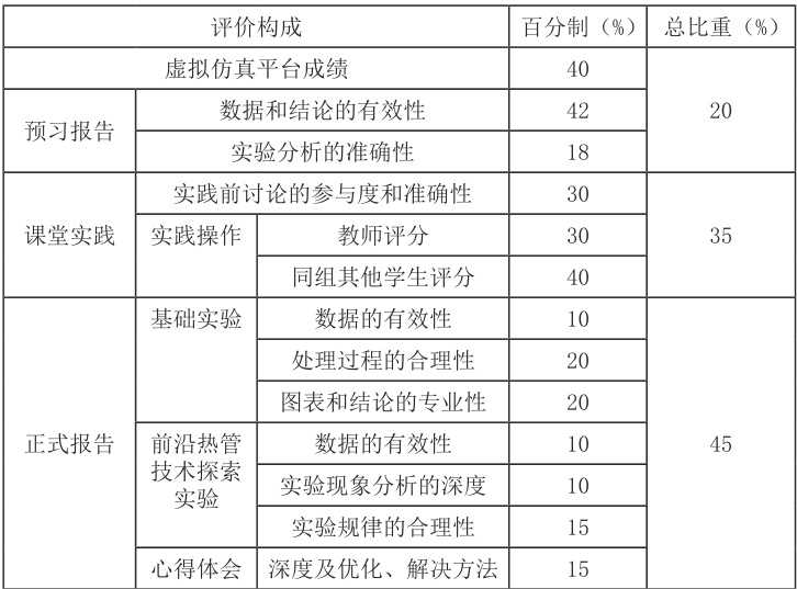 从实践课程的重要性、预习和自主通过虚拟仿真实践发现问题、实践前的讨论和实际操作、前沿科学研究-热管传热性能和黏度的关系探究及撰写报告的全过程,采用综合的评价手段评估学生的能力,在整个实践教学的环节,丰富学生的实践方式,培养学生发现问题、能够利用工程思路和方法解决问题、团队协作和探究等的综合能力。