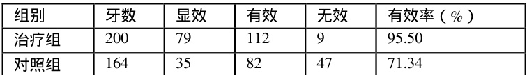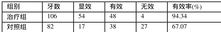 显效;治疗前后度数差值 ≥2 。有效:治疗前后度数差值为1。无效:治疗前后度数差值为0,有效率( 100% )=显效牙数 + 有效牙数/总牙数 Δxl00%