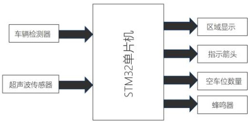 车辆车位引导系统的核心是 STM32 单片机,另外系统输入设备有车辆检测器、超声波传感器等,输出设备有显示设备(区域显示、指示箭头、空车位数量显示)和蜂鸣器等。