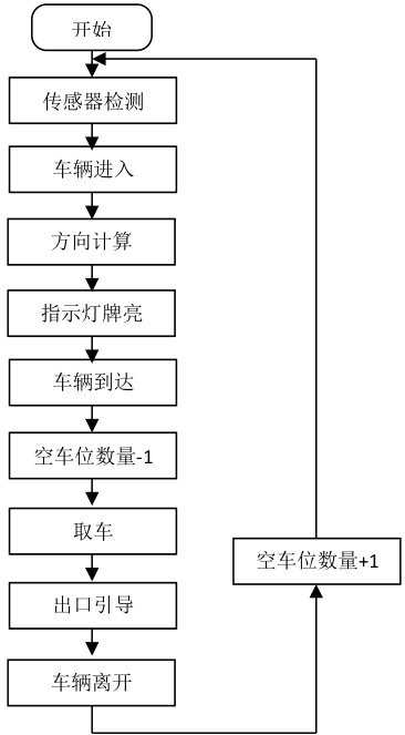 当车辆进出停车场入口时,车辆检测器将检测到的信息送入控制与管理计算机,计算机用于掌握着停车场实时的车位占用情况,根据欲停车车位的剩余空间和无车辆泊位分布情况,计算出一个最佳停泊车地点或分区号,将其输入到车位引导 LED 显示屏,并开启车辆行车路线的灯光指示或区域指示屏。驾驶员通过车位引导显示屏或指示灯牌和交通引导路标的引导下,将车辆行驶到指定的泊位上。当指定的是分区号,驾驶员也可停泊在该区的任一空泊位上,不会影响下一车辆的引导,因为安装在该车位上方的超声波检测器立刻检测到该车辆,并将该车位已被占用的信号传送至车位引导控制器,车位引导控制器对车位情况及时间等信息进行处理,存储并上传至管理计算机,计算机数据库会及时更新。每台车位控制器控制 20 ——60 车泊位。当车辆离开车位时,安装在该车位上方的超声波检测器,立刻检测到该车位已无车辆,在延迟一定时间后,将该车位已无车的信号发送到主控制器。避免车主因调整停车位置导致主控制器误判。如图2 所示为系统主流程图。