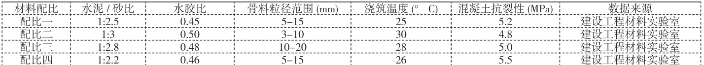 施工工艺合理性与材料配比直接影响现浇混凝土楼板裂缝问题。混凝土配比不当,像水泥、沙子、骨料比例失衡,会使混凝土抗裂性降低,进而加剧裂缝发生【2】。浇筑过程工艺操作不规范,比如混凝土搅拌不均匀、浇筑时产生气泡或浇筑过快,都可能导致混凝土密实度不足,形成微裂缝,BIM 技术能在施工前模拟不同材料配比对混凝土的影响,帮助施工人员优化材料选择与工艺参数,保证施工质量,减少裂缝产生风险。见表1: