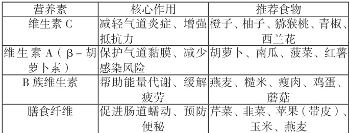 COPD 患者长期处于“氧化应激状态”(气道炎症持续存在),且因活动量减少易发生便秘——便秘时腹压升高会向上挤压胸腔,限制呼吸运动,加重气短。维生素能对抗氧化应激、增强免疫力,膳食纤维能预防便秘,二者需同步补充。