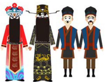 其次是添加补间动画,实现动画效果。在 Animate 软件中,首先将人物的手臂、腿部、躯干等部分分别转换为独立元件,在时间轴上设置关键帧,定义动作的开始和结束状态。例如在奔跑起始帧,将手臂和腿部调整为向后摆动的姿势;在结束帧,调整为向前摆动的姿势。选中两个关键帧,选择创建“补间动画”,软件自动生成中间过渡帧,实现动作的平滑过渡。随后,根据剧情的安排,实现不同人物的动画效果,然后对动画进行逐帧检查,针对肢体位置不自然、动作衔接不流畅的部分进行手动调整,确保动作符合人体运动规律且具有祁剧身段表演的韵味。