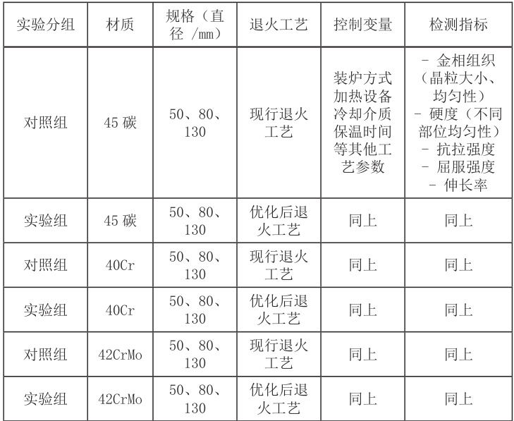 验证优化后的退火工艺的有效性的办法 --- 设计科学合理的实验方案。可以选取不同材质和规格的棒材作为实验的研究对象,包括 45 碳,40Cr,42CrMo ,每种材质的棒材可以选取直径为 50mm 、80mm 和还有 130mm 三种规格。