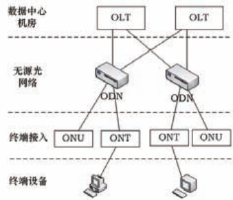 无源光网由机房侧的光线路终端(Optical Line Terminal,OLT)、用户侧的光网络单元(Optical Network Unit,ONU)和光配线网络(OpticalDistribution Network,ODN)组成,其整体网络架构如图 1。