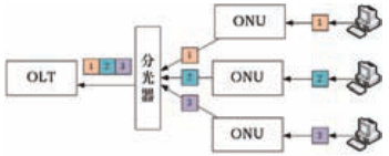 无源光网是一种非对称、点对多点(P2MP) 的光纤传输和接入技术,基于波分复用(WDM)技术,在一根光纤中同时传送处理双向信号。上行采用时分多址接入(Time Division MultipleAccess,TDMA)技术,每个ONU 在由OLT 统一分配的时隙中发送数据帧,如图2。