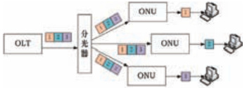 下行采用多点广播的方式, 由 OLT 向所有 ONU 发送带有标示号的数据帧,各个ONU 通过识别比对自身标示号决定是否接受该数据帧,如图3。
