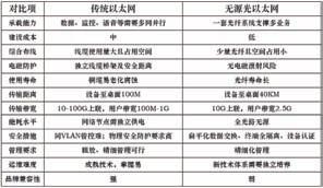 对于网络架构,将以太网中的接入层优化为无源光局域网,上行部分更换为 OLT,下行部分更换为 ONU,而中间的传输网络则通过光纤组网,优化后的网络结构更简单,使得网络扁平化,部署成本更低,同时具有网络大带宽、高可靠性、扁平化、易部署、易管理等优点,能更好地满足于用户网络业务需求,解决了现有网络的电磁泄射防护、桌面带宽低、网络设备升级困难以及运维管理难等问题,传统以太网与无源光局域网网络架构对比图,见图 6
