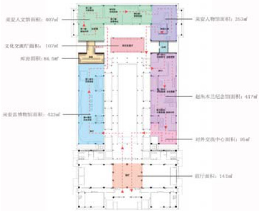 来安县博物馆总展陈面积约 1800m²(含非展览辅助空间),采用主题集群式布局,如图 2-1 所示,核心功能区面积分布如表2-1 所示: