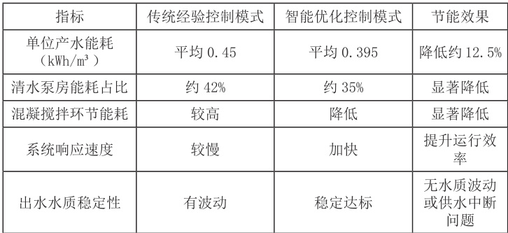 10 万吨,主要工艺流程包括取水、混凝、沉淀、过滤、消毒及清水输送等环节,其运行过程中水泵和搅拌设备能耗占比较大,具备较强的节能改造潜力。实验前首先对水厂的历史运行数据进行采集与分析,涵盖进水量、水质参数、设备启停状态及能耗记录等内容,并据此建立基准能耗模型,用于后续节能效果评估。随后,在原有 PLC/SCADA 系统基础上集成智能控制模块,将构建的能耗优化模型嵌入到控制系统中,实现对关键设备如提升泵、加药泵及搅拌机的动态调控。实验采用对照法进行,分为传统经验控制模式(对照组)与智能优化控制模式(实验组),在相同水源条件和供水负荷下对比两种模式下的能耗表现。实验周期持续三个月,覆盖不同季节工况,以全面评估系统的适应性与稳定性。为确保实验数据的真实性和可比性,所有运行参数均通过自动化系统实时采集,并设置数据校验机制以排除异常波动的影响。实验结果显示,在智能控制模式下,水厂单位产水能耗平均降低约 12.5% ,其中清水泵房与混凝搅拌环节节能效果尤为显著;同时,系统响应速度加快,出水水质指标稳定达标,未出现因控制调整带来的水质波动或供水中断问题。