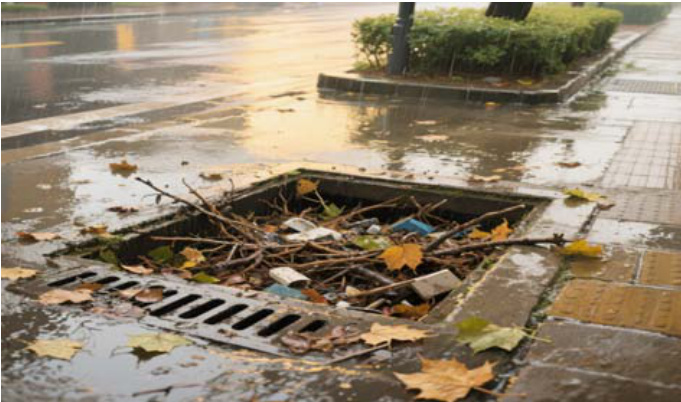 下完雨后,大量枯枝落叶和杂物被雨水冲到了邻近绿化带区域的雨水进水口,这也导致了雨水口出现了堵塞的情况,如图 1 所示。如果现场采用人工处理的话,每次处理的时间很长,且不能解决根本问题,下次下雨还会出现雨水口杂物堆积并堵塞的情况。