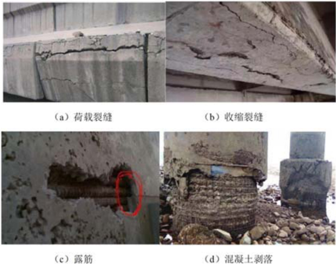 钢筋混凝土结构病害的表现形式大多为裂缝、露筋与混凝土剥落等,这些是造成混凝土结构力学性能退化的主要原因[2]。裂缝按成因可分为荷载裂缝、温度裂缝和收缩裂缝:荷载裂缝多因长期超重车辆通行导致结构应力超限,尤其简支梁桥跨中区域易出现受弯裂缝;温度裂缝源于混凝土热胀冷缩产生的应力累积,在昼夜温差较大地区尤为明显;收缩裂缝则与混凝土配合比不当、养护不足有关,早期水分流失过快易引发表面龟裂。露筋与混凝土剥落通常由钢筋锈蚀膨胀所致,当混凝土碳化深度超过保护层厚度,钢筋失去碱性保护发生锈蚀,体积膨胀使周边混凝土开裂剥离。此外,酸雨、盐雾等腐蚀性环境会加速混凝土劣化,降低结构耐久性,如图1 所示。