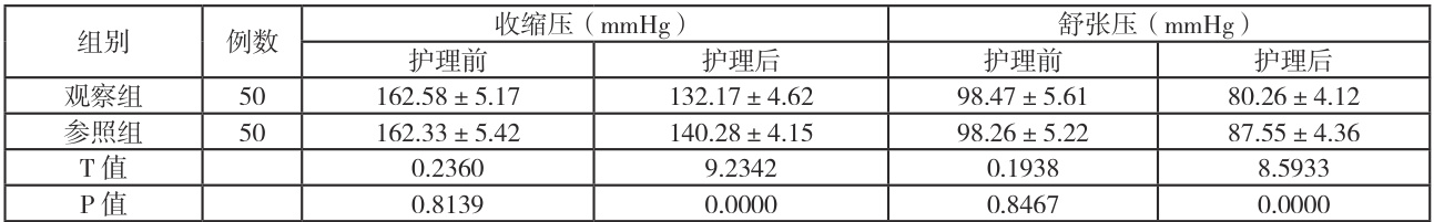 将 2021 年 ~2024 年在本院接受治疗的 100 例高血压患者纳入临床实验当中作为观察对象,按照随机分组的方式将每 50 例分别纳入在参照组以及观察组当中,其中参照组患者包括 25 例男性,25 例女性,最小患者年龄 50 周岁,最大患者年龄 85 周岁,年龄均值( 72.11±7.63 )岁,观察组患者包括 26 例男性,24 例女性,最小患者年龄51 周岁,最大患者年龄84 周岁,年龄均值( 72.38±7.61 )岁。对照所有患者一般资料,未见显著差异, p>0.05 。