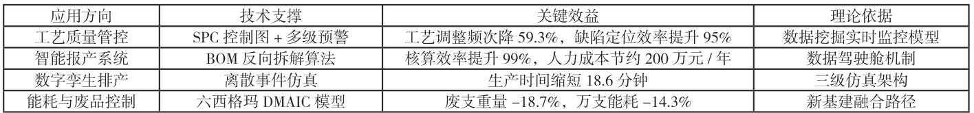 目前大数据在卷烟生产企业的应用主要分为四种情况,分别为质量监控的数字化、智能报产系统的应用、排产数字化以及能耗与废品的数字融合分析。首先,工艺质量监控已经从传统抽检升级为全过程的数字化监控。通过高频传感器大量部署,实现烘丝温度、加香流量等参数的实时数据采集,结合统计过程控制技术实现动态阈值预警。当参数偏离预设范围时,便会自动触发分级推送机制。郁桂华等 [1] 研究表明,此类系统可将工艺调整频次降低 59.3% ,缺陷定位时间压缩至传统模式的 5% 。谭震等 [2] 进一步验证了在混丝加香工序中,基于数据挖掘的 SPC 实时监控系统能通过智能积分器提升控制精度,满足工艺要求的实时化、智能化的质量控制要求。其次,智能报产系统代替了人工计算。针对多品牌共用烟叶等级导致的分配不准确问题,应用反向拆解算法建立 BOM 智能解析模块,实现品牌需求到原料消耗的全闭环管理。该系统可解决接口数据舍入误差(如水分值存储位数不足引发的报产偏差),使核算时间从 30 分钟降至秒级,准确率达 99.6% 。郁桂华 [1] 等证实,此类平台可减少人工报表打印量 100% ,人力成本节约超 200 万元 / 年。