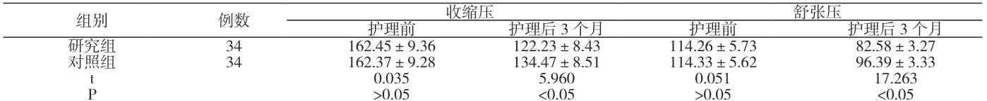 护理前,两组收缩压和舒张压数值差异均不明显( P>0.05 );护理后 3 个月,两项血压值均有下降,研究组下降更明显,两项数值均低于对照组( P<0.05 )。见表1。