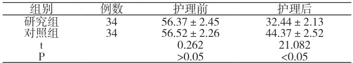护理前,两组焦虑评分差异不明显( P>0.05 );护理后,评分均有降低,研究组降至比对照组更低的水平( P<0.05 )。见表 2