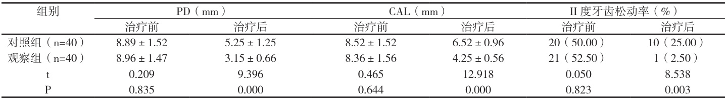 观察组 PD、CAL 和 II 度牙齿松动率低于对照组( P<0.05 )。如表2 所示。