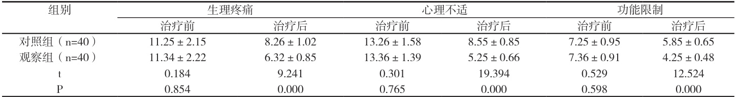 (3)观察两组的口腔健康评分。口腔健康影响程度量表(OHIP-14)评价,包括生理疼痛、心理不适、功能限制等方面,各维度均为 0-20分,分数越低,质量越好。