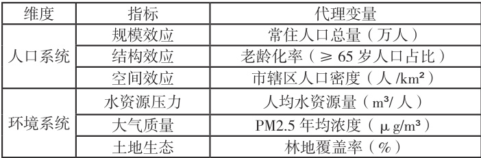 变量选取考虑人口系统和环境系统两大维度:人口系统涵盖规模(常住人口总量)、结构(老龄化率)、空间效应(人口密度);环境系统聚焦水资源(人均水量)、大气质量(PM2.5 浓度)、土地生态(林地覆盖率)。各指标通过具体代理变量量化,如用"万人"表征人口规模,以 " μg/m311 监测大气污染,林地覆盖率以百分比反映生态状况,形成多维度动态分析框架。