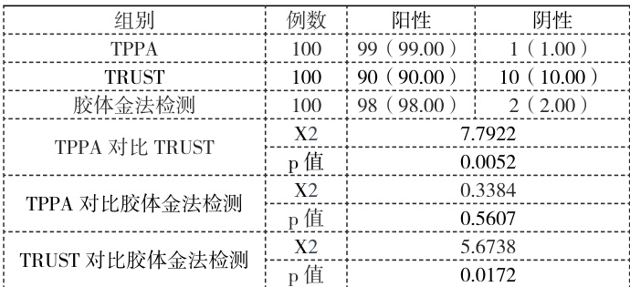 梅毒是一种系统性慢性性传播疾病,其传播途径主要为母婴垂直传播、性接触以及血液传播,该病的病程相对较长,并且具有复杂的临床分期,在发病后会累及不同器官,需要及时加以治疗。根据临床症状表现以及感染时间,将梅毒分为 1 期、2 期、3 期以及潜伏梅毒 [2],其中 1 期梅毒以生殖器无痛性溃疡作为主要临床症状,患者一般会出现局部淋巴结肿大的情况;2 期则以扁平湿疣、全身性梅毒疹、头痛、发热等作为主要症状表现,此时具有较强的传染性;3 期梅毒会对神经系统、心血管系统以及骨骼产生波及,诱发脊髓痨、主动脉瘤或树胶肿等不可逆的损伤,对患者生命安全构成严重威胁;潜伏梅毒通常不会出现明显症状,但是在临床血清学检测下会出现阳性结果 [3]。针对该疾病,实验室检测是主要措施,临床当中主要包括 TPPA、TRUST 以及胶体金法检测三种不同的技术,但是三种检验技术的灵敏性存在较大差异,因此深入对比这三种检测技术对于确定临床检验方案具有至关重要的意义。