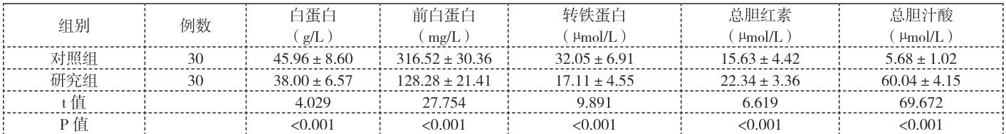 纳入白蛋白、前白蛋白、转铁蛋白,总胆红素、总胆汁酸等各项指标,对比两组受检者上述指标差异。