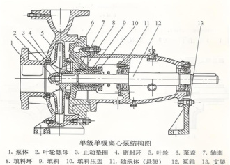 1. 泵体;2. 叶轮螺母;3. 止动垫圈;4. 密封环;5. 叶轮;6. 泵盖;7. 轴套;8. 填料环;9. 填料;10. 填料压盖;11. 轴承体(悬架);12. 泵轴;13. 支架