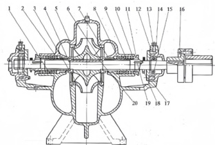 1. 泵体;2. 泵盖;3. 叶轮;4. 泵轴;5. 密封环;6. 轴套;7. 填料套;8. 填料;9. 水封环;10. 压盖;11. 轴套螺母;12. 轴承体;13. 固定螺钉;14. 轴承体压盖;15. 滚动轴承;16. 联轴器;17. 轴承端盖;18. 挡水圈;19. 螺杆;20. 键