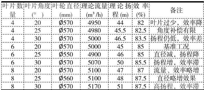 单吸泵叶轮因单侧进水,几何参数调整需注重入口流量均匀性,避免局部涡流。双吸泵叶轮通过对称布局优化流体分布,微调几何参数可降低轴向力与振动幅度。基于文献 [6] 理论模型结合 SL0150-570A 实际工况参数,我们通过对比不同参数组合对理论水力性能的影响来确定优化方案。主要考虑的因素包括流量、扬程、效率以及对空化风险的抑制。经过多组参数的理论分析与权衡,我们确定了优化方案:将叶片数量增至8 片,叶片角度调整至25°,叶轮直径调整为 0560mm 。