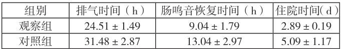① 疼痛程度:用视觉模拟评分法(Visual Analogue Scale,VAS)评定术后即刻、术后24 小时、术后72 小时的疼痛状况,分值为0~10 分,0 分为不痛,10 分为疼痛感剧烈,得分与患者的疼痛等级成正比。 ② 康复效果:观察患者术后排气次数、肠鸣音恢复情况及术后住院天数。 ③ 并发症:对患者发生胆瘘、呼吸道感染、排尿困难、腹胀等并发症情况进行记录。