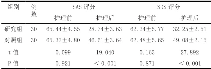 2.3 两组接受护理前后SAS、SDS 评分指标比较
