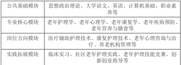 突破传统技术型人才培养局限,将人才培养目标定位为 “三型合一” 的复合型人才,即老年护理技术指导型人才、老年护理管理人才和老年护理创新创业型人才。具体而言,技术指导型人才需掌握扎实的老年护理专业知识和操作技能,能够指导一线护理人员开展工作;管理型人才需具备养老机构运营管理、团队协调等能力;创新创业型人才需具有创新思维和创业能力,能够在老年护理领域开拓新的服务模式或项目。这一目标重构旨在解决现有人才 “下不去、留不住、用得着、干不好” 的问题,提高人才与岗位的匹配度。