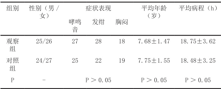 我院 2024 年 1-12 月 102 例小儿支气管哮喘发作期患者,随机分为观察组、对照组,51 例/ 组。患者均签署同意书,无中途离院、死亡、资料丢失等导致脱落的情况,两组一般资料比较,差异无统计学意义( P>0.05 )。见表 1
